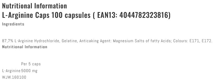 • Οι κάψουλες L-Arginine περιέχουν 1 γραμμάριο L-Αργινίνης υψηλής ποιότητας, την υδροχλωρική L-Αργινίνη, η πιο κατάλληλη για να καλύψει τις απαιτήσεις του σώματός σας.