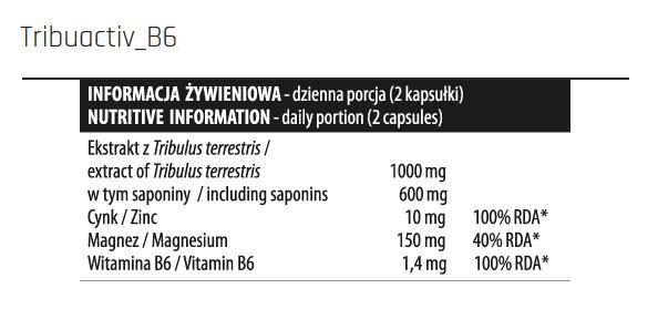 INGREDIENTS: extract of Tribulus terrestris (60% of saponins), magnesium – magnesium oxide, anti-caking substance E470b, zinc – diglicynian zinc, vitamin B6 – pyridoxine chloroxide, shell ingredients: gelatine, dye E171, E132. Product may contain trace amounts of soya bean, wheat and nuts. PACKAGE CONTENT: 90 Capsules. 1 capsule weighting 800 mg.