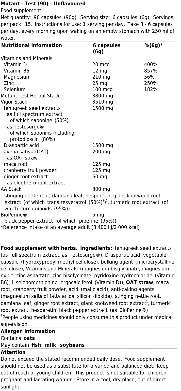 The new and improved MUTANT TEST includes targeted levels of six active ingredients featuring clinically-tested TestoSurge™, as well as zinc, selenium, magnesium and vitamin B6 for optimal hormonal activity. TestoSurge™ works through multiple physiological
