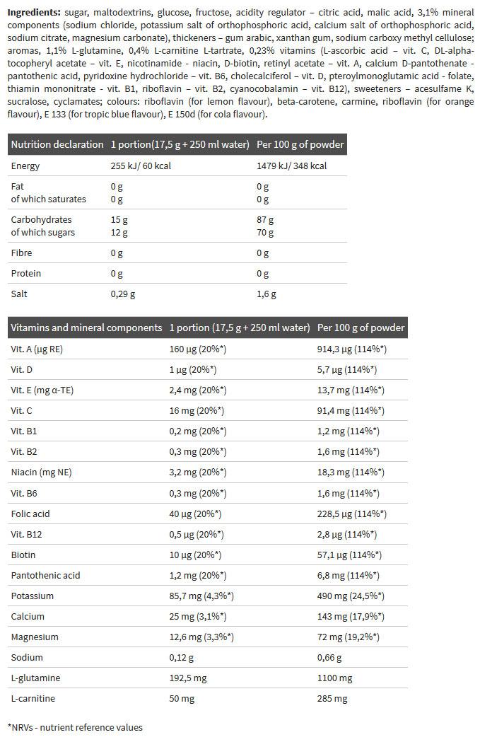 Συμπύκνωμα Υδατανθράκων - Ηλεκτρολυτών σε σκόνη με σύνθεση σημαντικών βιταμινών και μετάλλων, ενισχύει την απορρόφηση του νερού κατά τη διάρκεια της σωματικής άσκησης και μπορεί να συμβάλει στη διατήρηση της απόδοσης & της αντοχής κατά την διάρκεια μίας παρατεταμένης προπόνησης/άσκησης αντοχής.