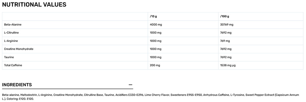 Η Βήτα-Αλανίνη στο Metapure Overdrive Pre Workout παίζει καθοριστικό ρόλο στην παραγωγή καρνοσίνης. Αυτό το διπεπτίδιο βοηθάει στη ρύθμιση του γαλακτικού οξέος κατά τη διάρκεια της άσκησης, ειδικά κατά τη διάρκεια σύντομων και έντονων προσπαθειών. Όσο περισσότερο γαλακτικό οξύ στους μυς, τόσο περισσότερη μυϊκή κόπωση δημιουργείται. Εάν η αρνητική επίδραση του γαλακτικού οξέος μπορεί να περιοριστεί, ο μυς μπορεί να εργαστεί περισσότερο, υποστηρίζοντας έτσι μεγαλύτερο φόρτο εργασίας που θα προωθήσει ταχύτερη πρόοδο, επιτρέποντάς σας να ωθήσετε περαιτέρω τα όριά σας.