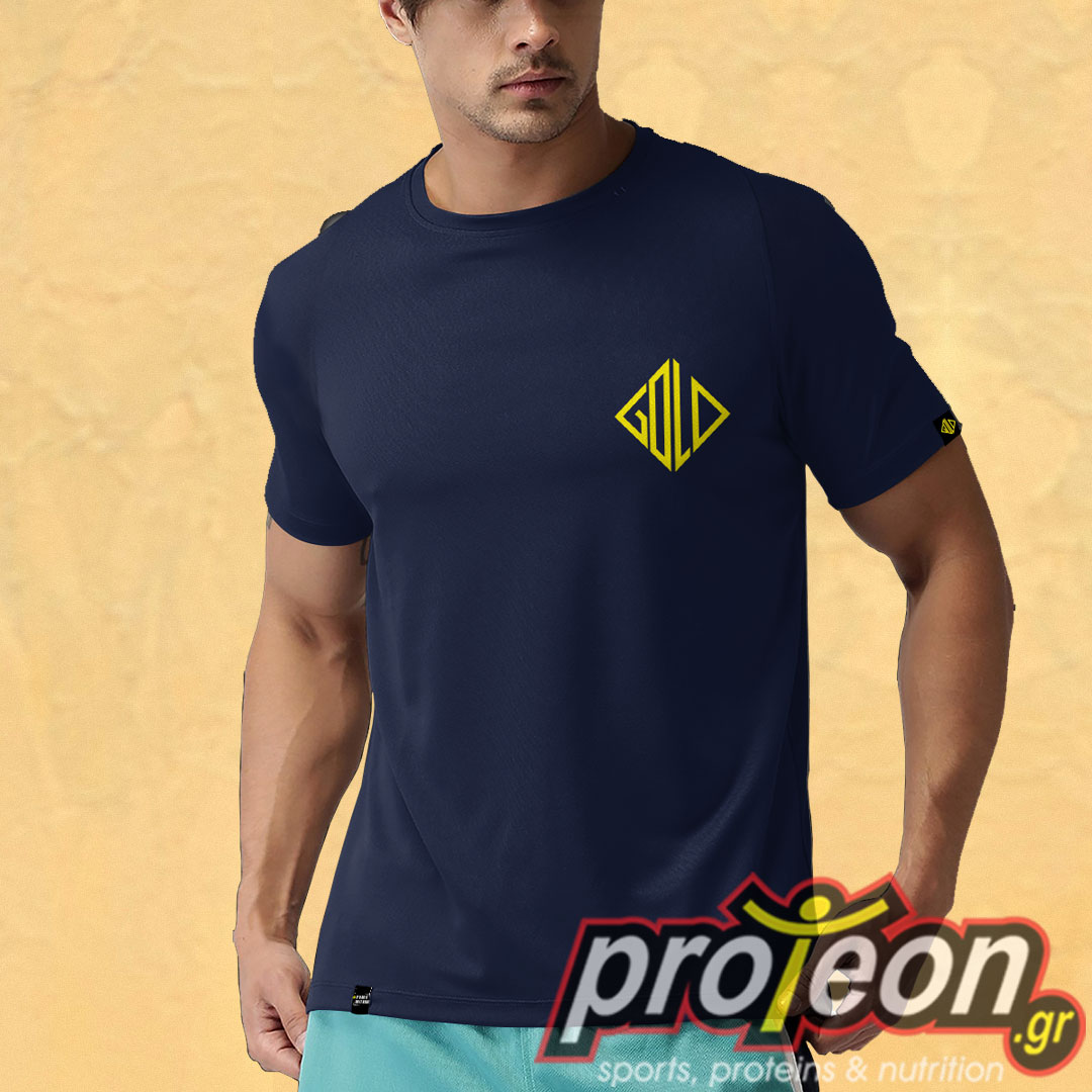 Σύντομη Περιγραφή Το Gold Touch T-Shirt σε Μπλε Χρώμα είναι βαμβακερό με κίτρινη στάμπα Gold & στενό ρεγκλαν μανίκι για τέλεια εφαρμογή.