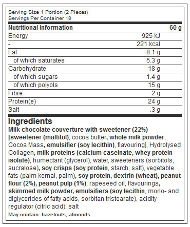 Κάθε μερίδα έχει 1.5 γραμμάρια σάκχαρα ή λιγότερο, ενώ προσφέρει 24 γραμμάρια πρωτεΐνης. Οι μπάρες έχουν κρεμώδη στρώση και τραγανή πρωτεΐνη.
