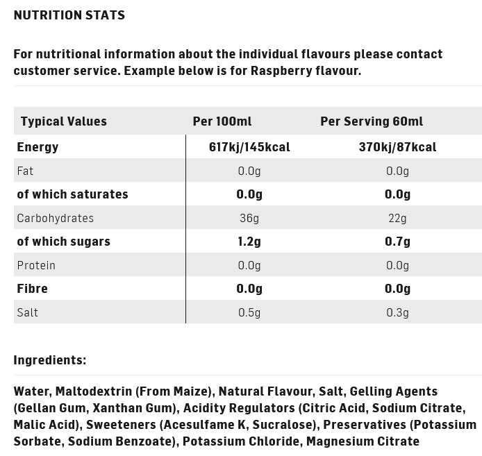 Το τζελ όχι μόνο παρέχει ταχεία παροχή εύπεπτων υδατανθράκων (22 γραμμάρια) για ενέργεια, αλλά παρέχει επίσης 118 mg νατρίου, 9,5 mg καλίου και 1,5 mg μαγνησίου ανά τζελ.